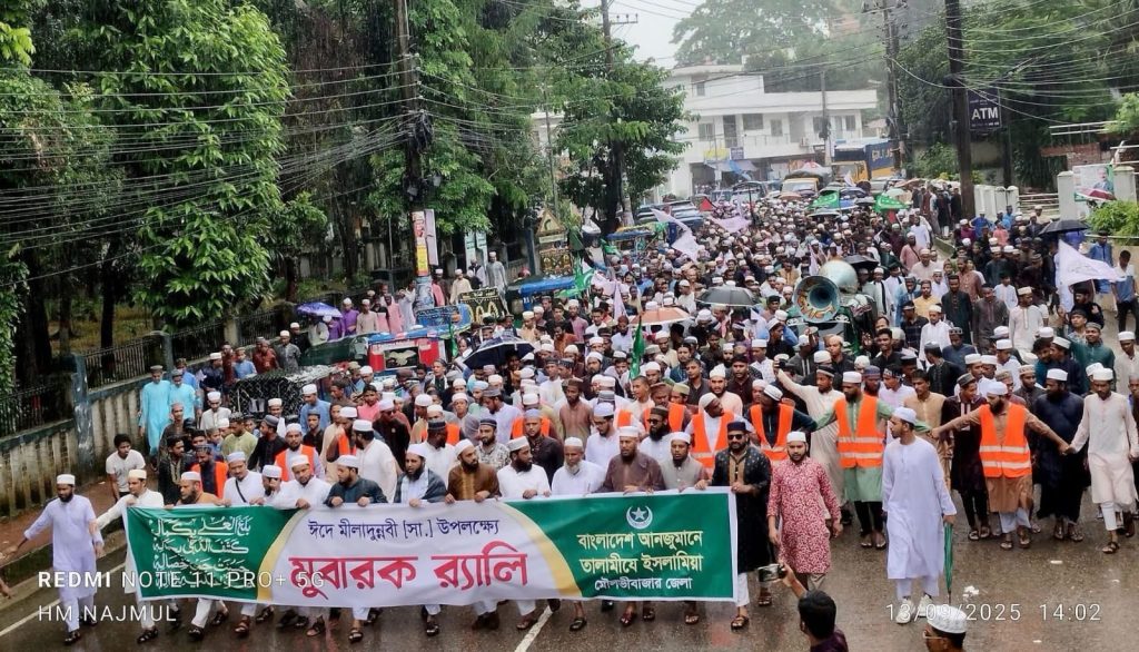 বৃষ্টি উপেক্ষা করে মৌলভীবাজারে হাজার হাজার ছাত্র-জনতার উপস্থিতিতে পবিত্র ঈদে মিলাদুন্নবী (সা.) র্যালি অনুষ্ঠিত হয়েছে।